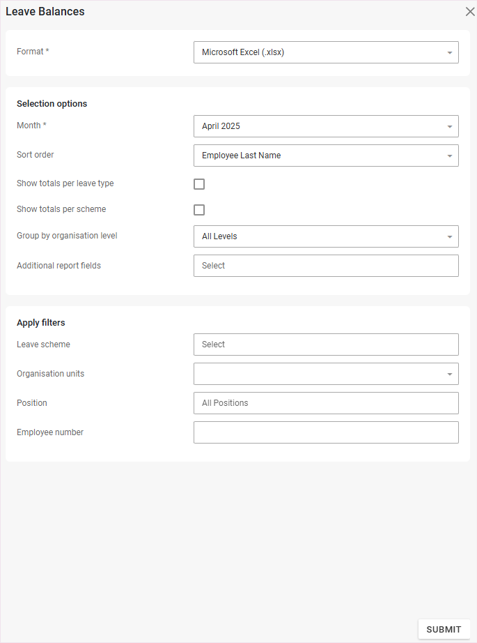 An example of the Leave Balances Report Parameters Screen: