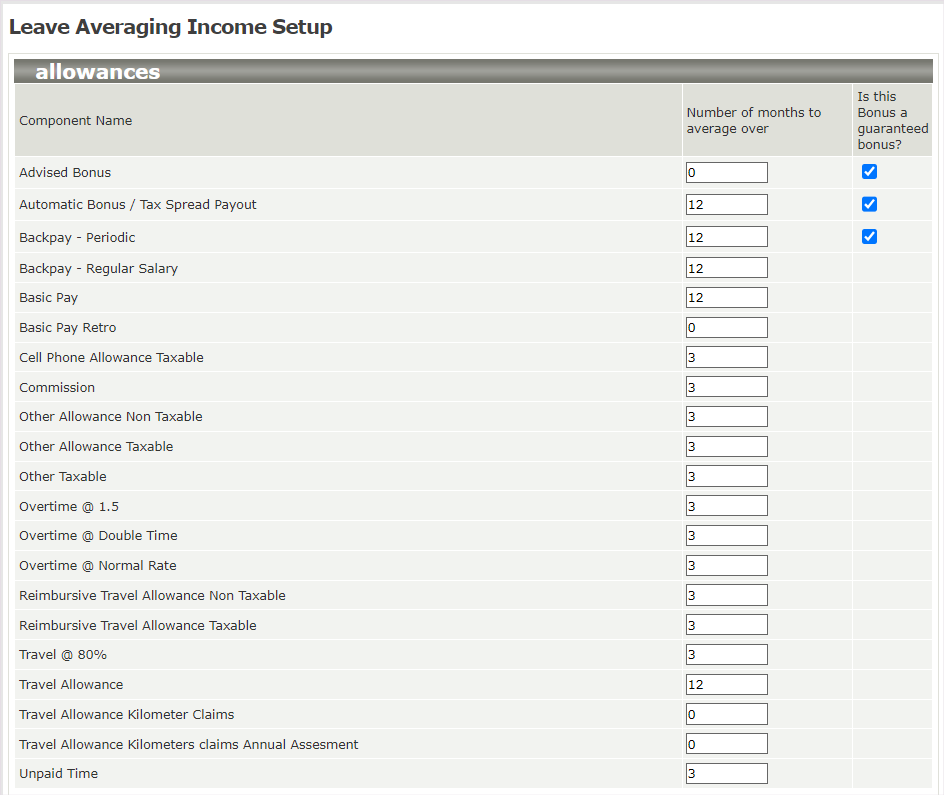Leave | The Leave Averaging Income Setup Screen