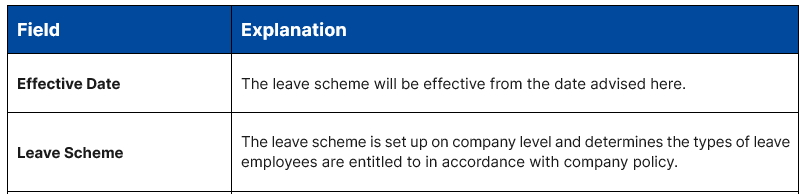 About Leave Administration allows you to apply the company’s leave policy on the payroll by creating Leave Schemes. Each Leave Scheme specifies the types of leave available to the employee, for example annual, sick, study or family responsibility ...
