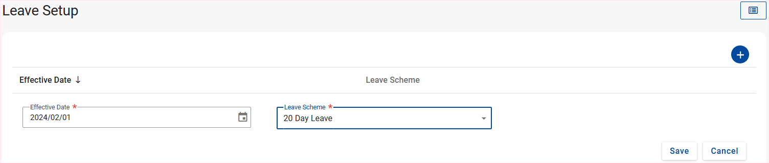 To link an employee to a leave scheme, click on the plus (+) icon.