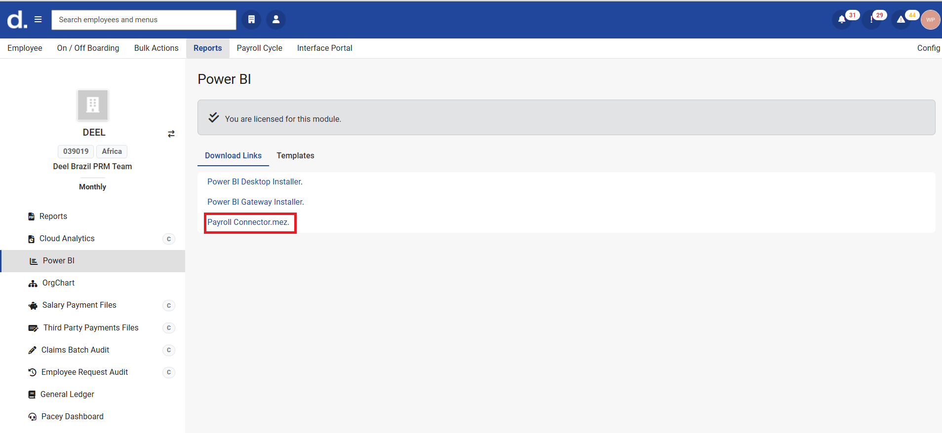 The Power BI module is an add-on module which is billed separately per user. Contact the Sales department sales@payspace.com for further assistance.