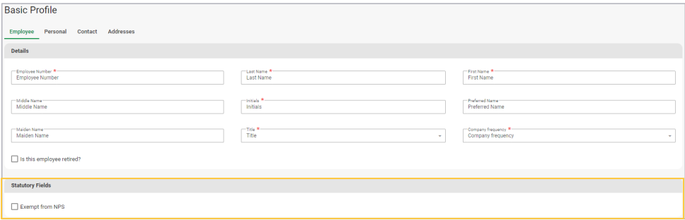 The preferred method of exempting employees from the NSSA contributions is via the custom exemption field on an employee's Basic Profile screen (Employee > Basic Information > Basic Profile > Heading: Employee > Subheading: Exemptions and Other). ...