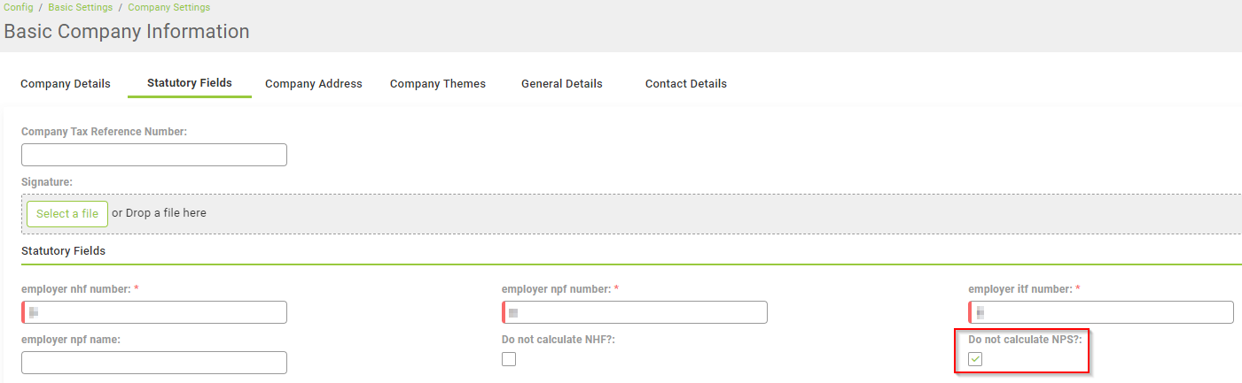 Please navigate via Config > Basic Settings > Company Settings > Basic Company Information > Statutory Fields Tab > Tick 'Do not calculate NPS'.