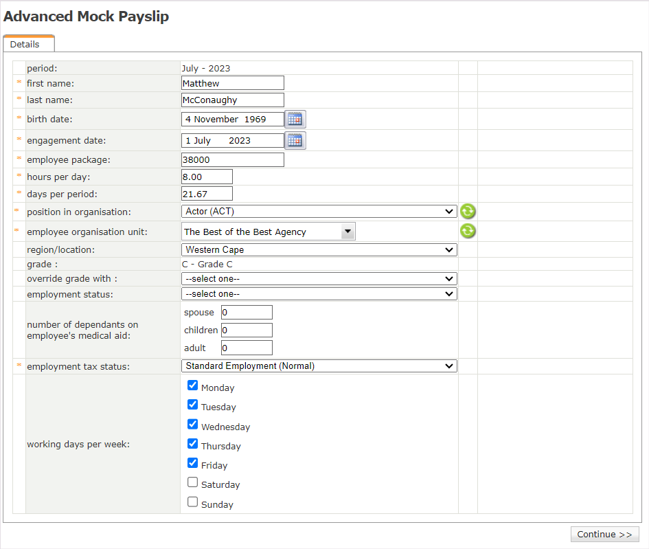 On the Advanced Mock Payslip Screen capture the required details and then click on
