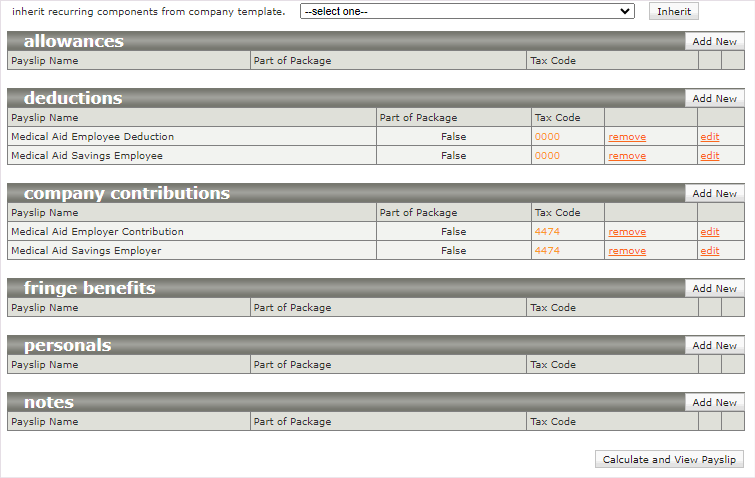 To Add the Recurring Payroll component select the Add New option next to the payslip action and proceed to add the relevant recurring components and then click on