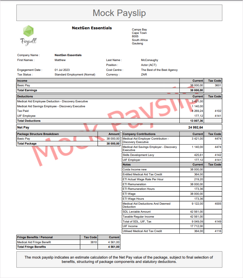 This applies to all PaySpace editions. A watermark has been added behind the figures of a mock payslip, decreasing the risk of fraud from any person receiving a mock payslip from your company. Navigate > On / Off Boarding > Create A Mock Payslip