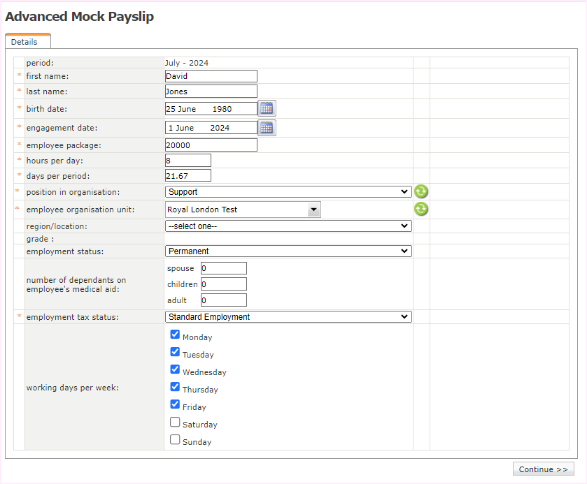 On the Advanced Mock Payslip Screen capture the required details and then click on Continue>>.