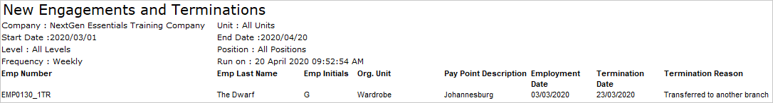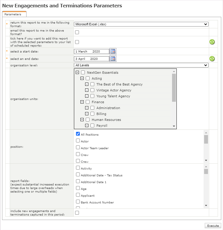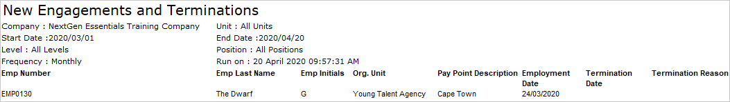 Complete the New Engagement and Terminations Report Parameters and execute the report.