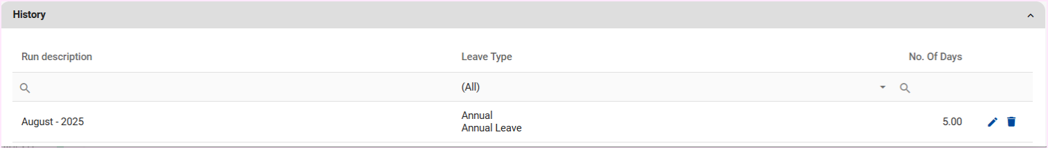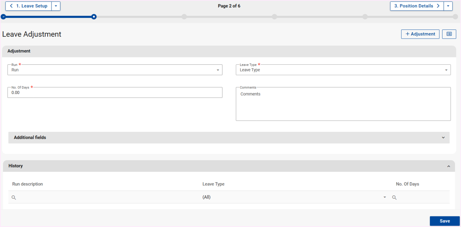 The leave balances of the previous entity will not transfer automatically, unless leave schemes have been mapped, as explained above. Use the Leave Adjustments Screen to process leave adjustments for the various types of leave.
