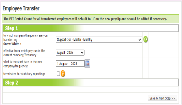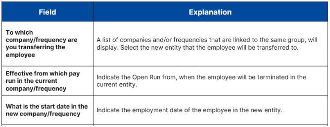 Where more than one company and/or frequency have been registered on the system, a need may arise for an employee to transfer from one entity to another. This article clarifies how to transfer an employee.