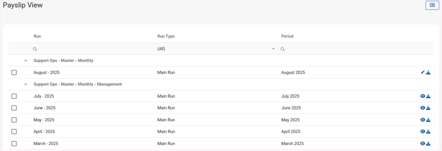 - The employee’s historical as well as current payslip records can be viewed on the Edit Payslip Screen. Similarly, if the employee is registered for Employee Self Service (ESS), the employee will have access to both entity’s payslip records.