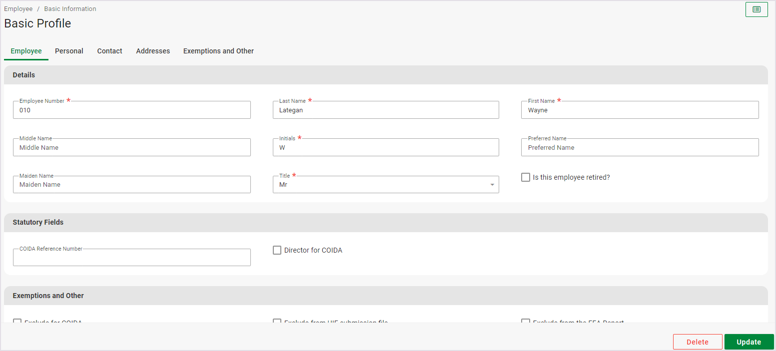 The option to delete an employee is only available for employees who have not yet been paid on the payroll. To delete an employee, navigate to the Basic Profile Screen.