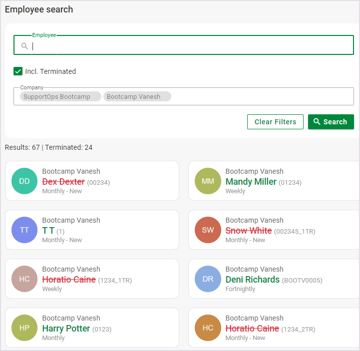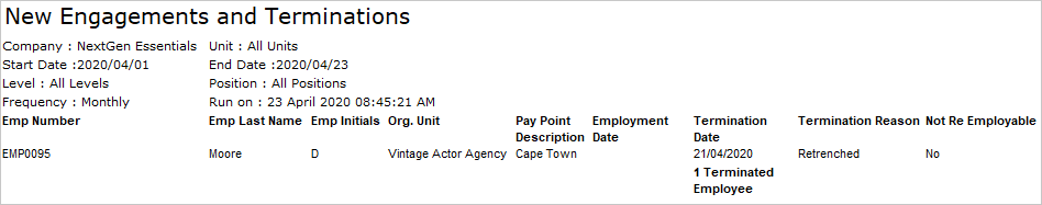 To extract a listing of the new engagements and terminated employees for a chosen period, print the New Engagements and Terminations Report.