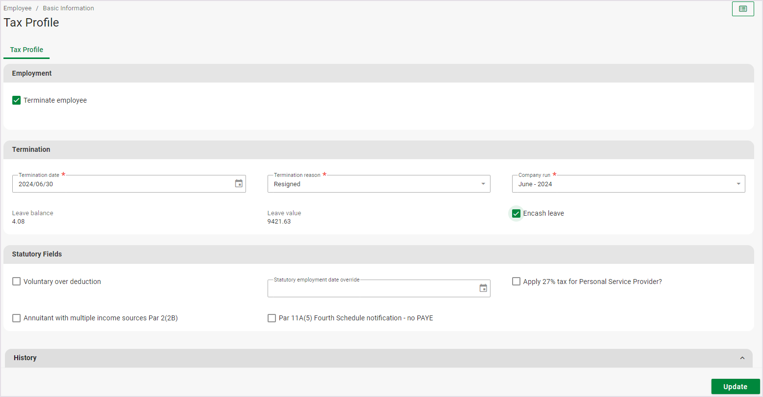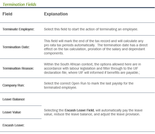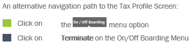 When an employee needs to be disengaged from the company, a termination needs to be captured during the employee’s final pay run. Terminations are processed on the Tax Profile Screen.