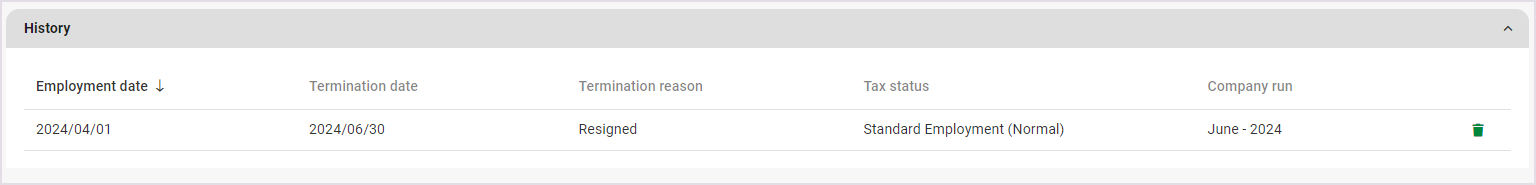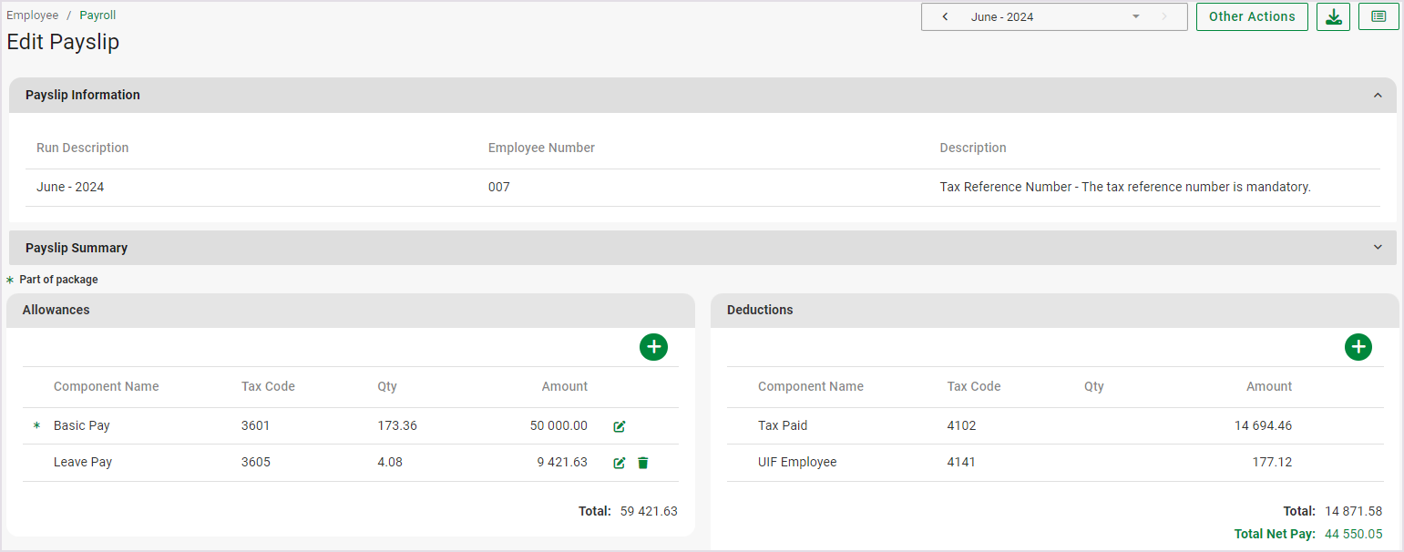 Although an employee has been terminated, a payslip within the tax year can still be created should payments be due. Click on + Payslip to generate a payslip record.