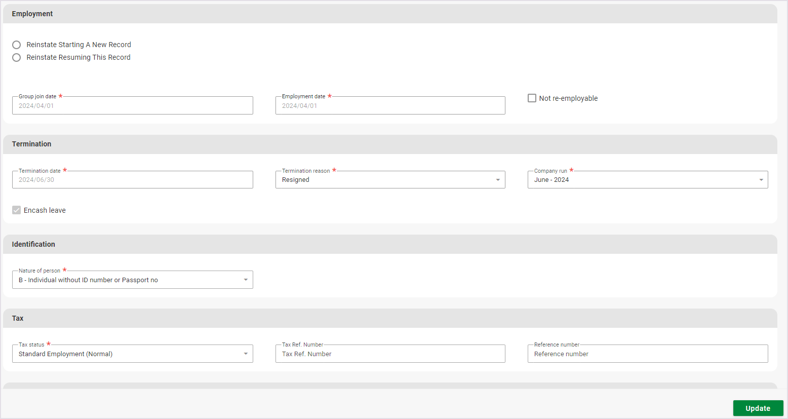 Before the tax year end, you should ensure all employees have been correctly terminated, as an employee cannot be terminated in a previous tax year. An employee can still be terminated one month after leaving. If more than two months have passed, please contact the Support Centre for assistance.