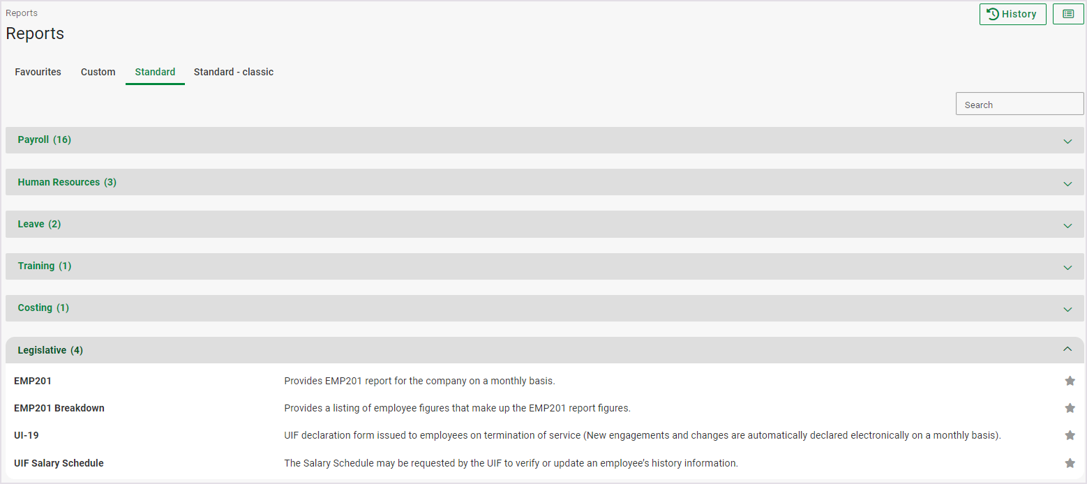 Navigate > Reports > Reports > Standard > Category Heading: Legislation