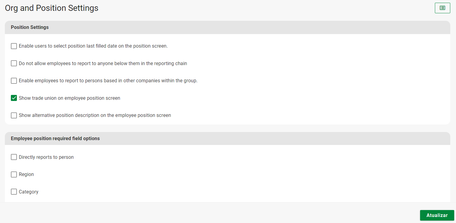 Show trade union on employee position screen: Displays the union the employee is associated with on the position screen. (Enabled, as indicated by the green check icon.)