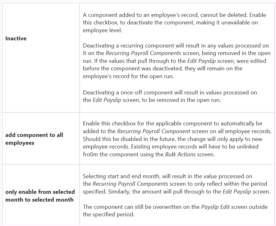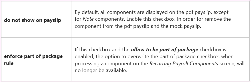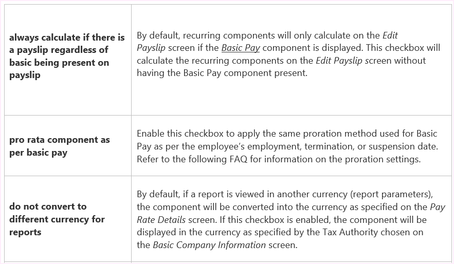 Payroll Components may be edited or reconfigured by selecting the "Edit" hyperlink on the right hand side of the applicable component, which will open a screen with numerous options.