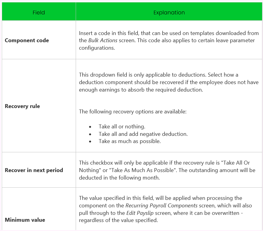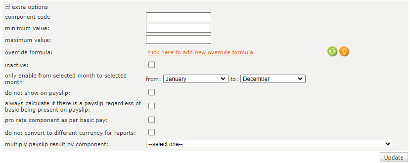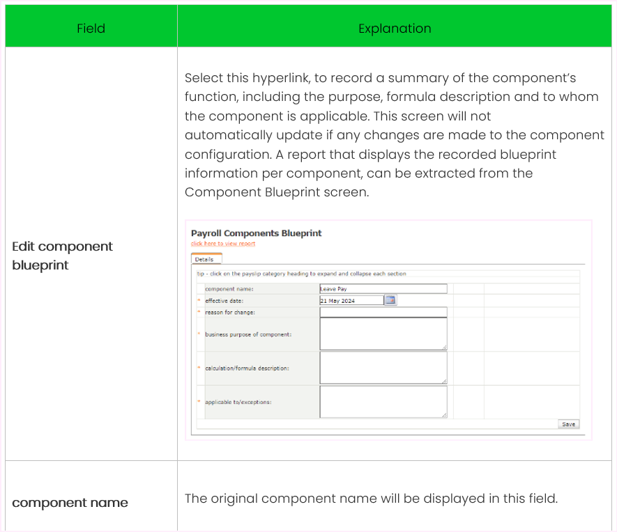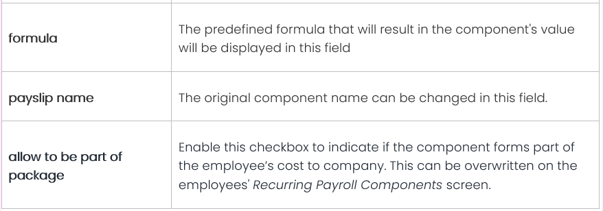 Depending on the type of component used, the landing page will allow users to view its original name, formula and change its name displayed on the Edit Payslip screen, as well as its income base.