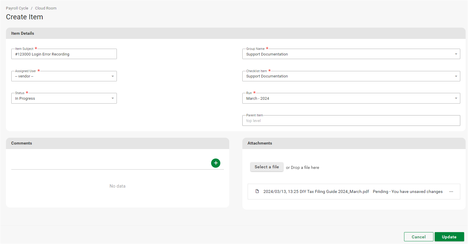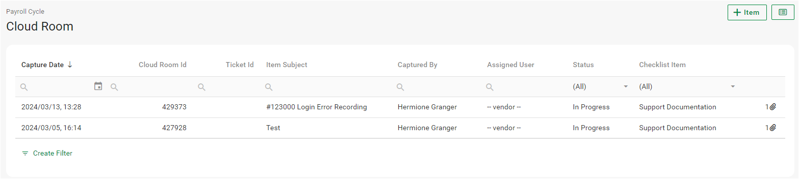 Navigate > Payroll Cycle > Cloud Room > + Item