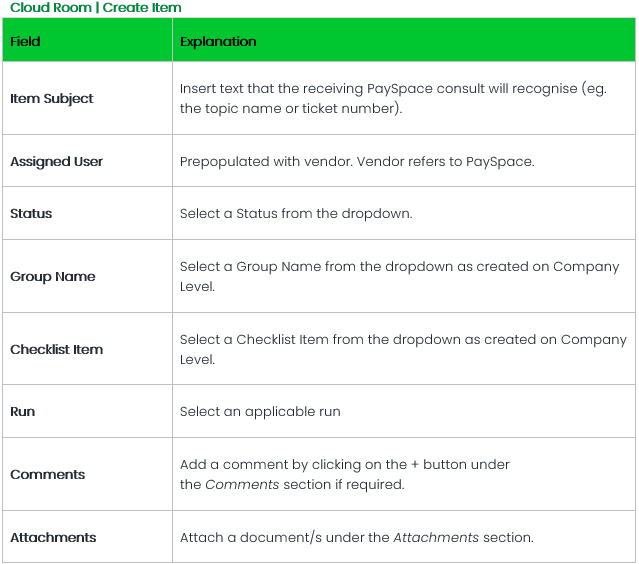 Cloud Room is a secure portal within PaySpace geared towards outsource environments and payroll processes where customers send information to PaySpace and vice versa for processing and feedback/response purposes. Instead of exchanging information via insecure methods such as email, Cloud Room provides a secure portal to upload as well as track item statuses. Information can easily be audited, traced, and retrieved in a central environment at any time rather than tracking down information stored in various locations. The second feature of the Cloud room is the ability to define the customer's regular or ad-hoc process steps which will remind and control the responsibilities of the relevant users (Customer and Vendor) via notifications. Auditability is thus also transparent on both sides.