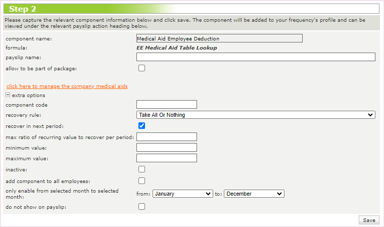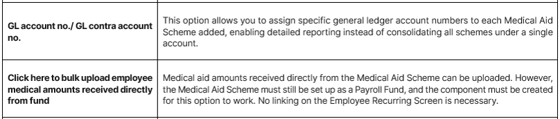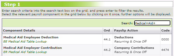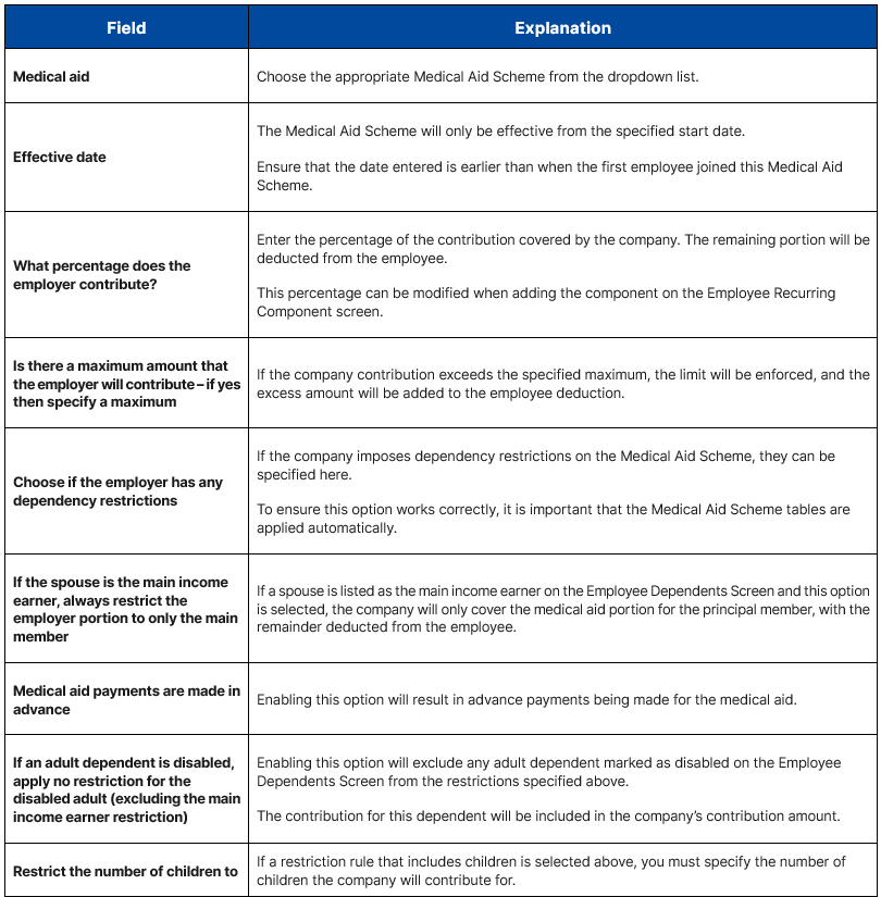 Once the Medical Aid Scheme has been setup, you will then need to create the Medical Aid Employee Deduction and the Medical Aid Employer Contribution components. The Medical Aid Scheme can then be linked to the employee on the Recurring Payroll Components screen on employee level.