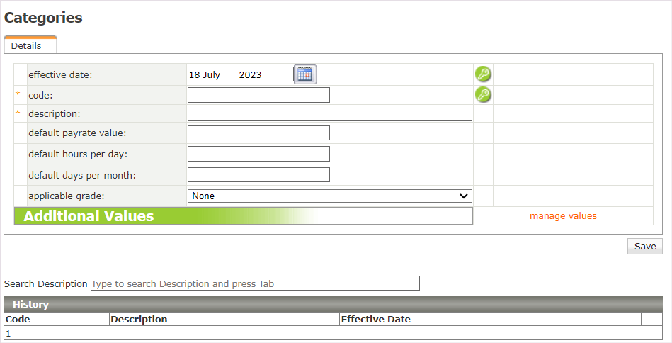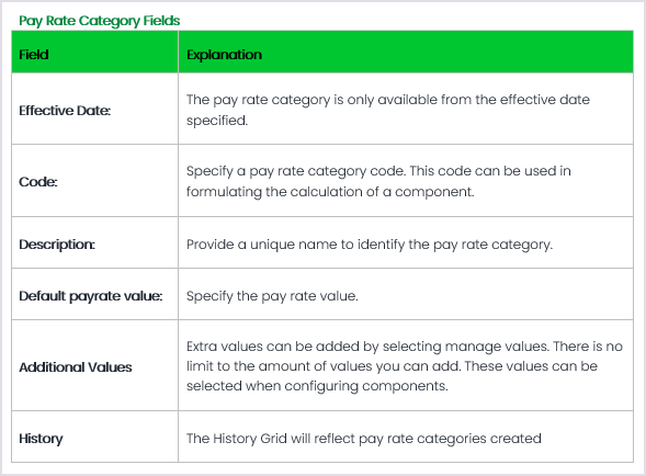 Pay Rate Categories link a defined pay rate value to an employee. Once you have created the categories, it is linked on the Employee Pay Rate Details Screen. When adding a new employee or applying an increase, the package will default to the pay rate value specified in the category. The amount can be overwritten. Pay Rate Categories can also be applied in formulating the calculation of a component an be selected as a report field when extracting reports.