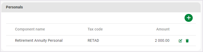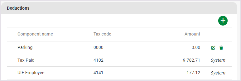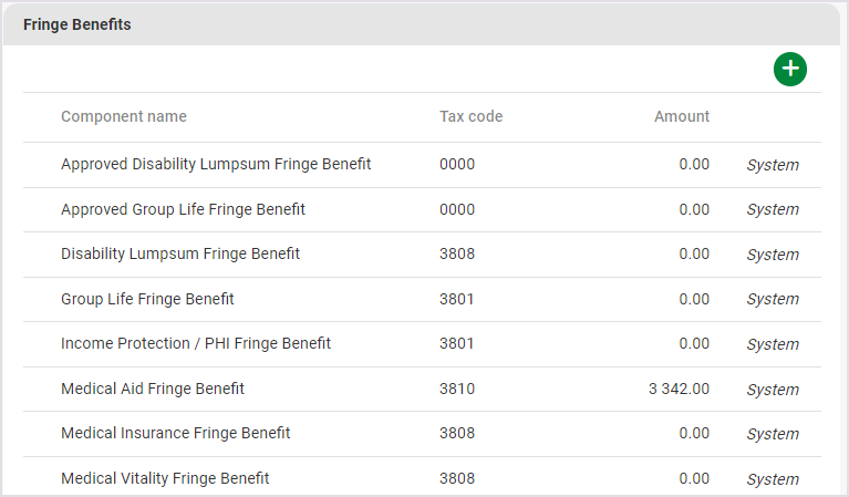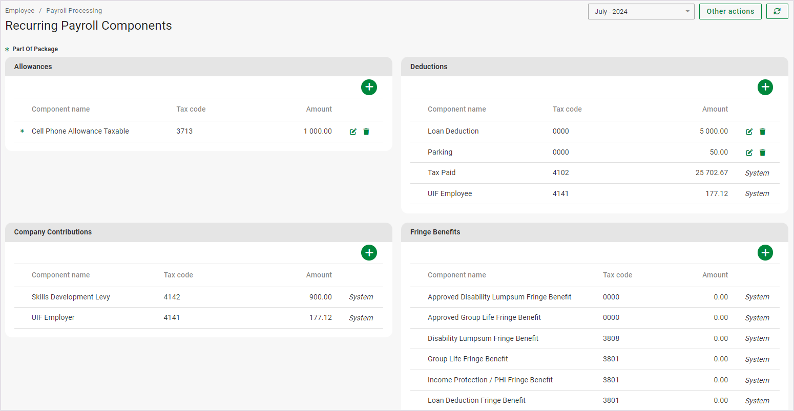 The Recurring Payroll Components screen consists of all fixed financial information, which will pull through to the Edit Payslip screen every pay period.