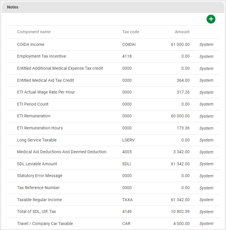 Notes: store important totals by default (e.g. PAYE, Taxable, Regular Income, Total SDL, UIF, Tax, Travel/Company Car Taxable, UIF Income). It can also be used to calculate, store and/or display any information not visible in the other categories above e.g. Retirement Funding Income, Bonus Tax Spread and Medical Tax Credit.