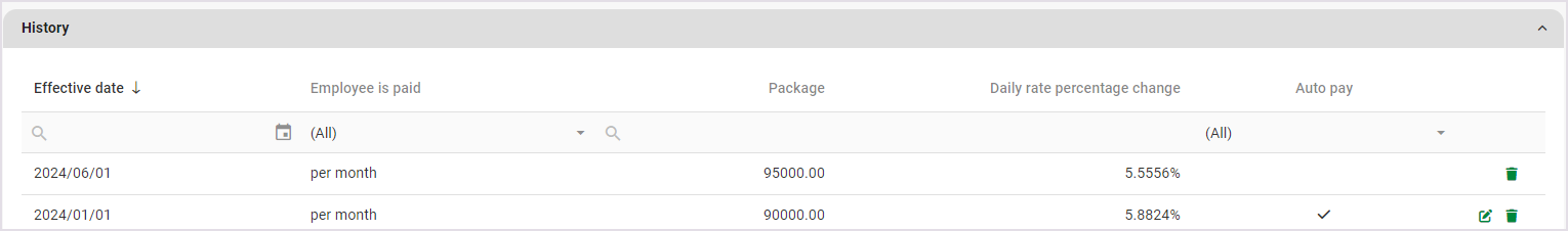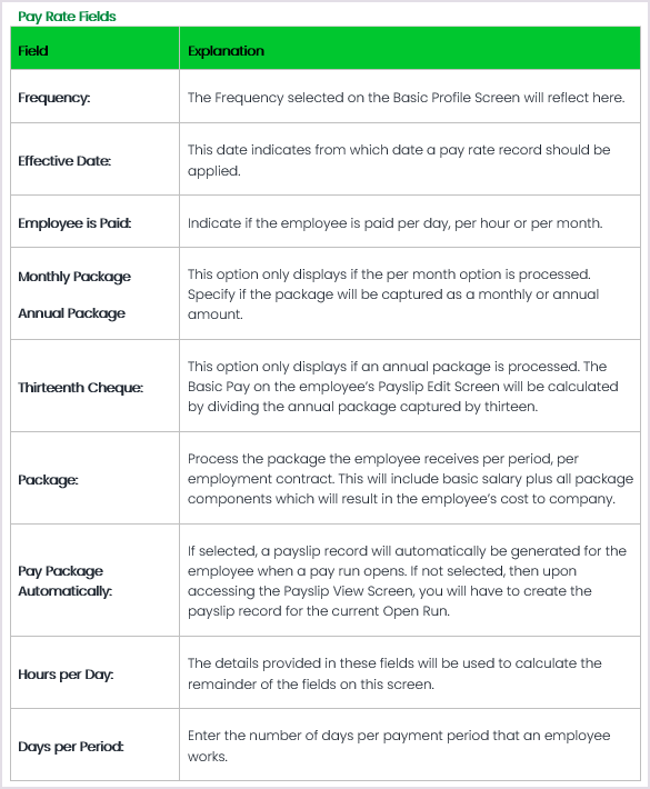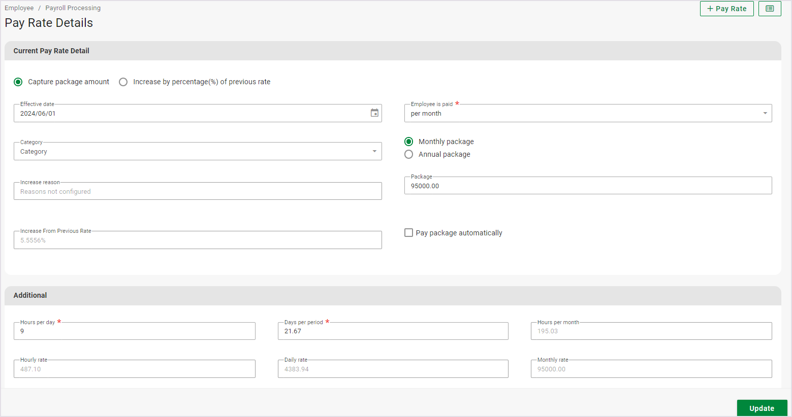 The Pay Rates Screen defines the employee’s package details as well as the frequency of payment. When an increase is applied a history of increase records will accumulate at the bottom of the Pay Rate Details Screen.