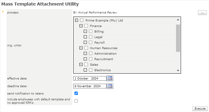 The Mass Template Attachment Utility screen is used to activate the review process for all employees who have approved KPI’s.