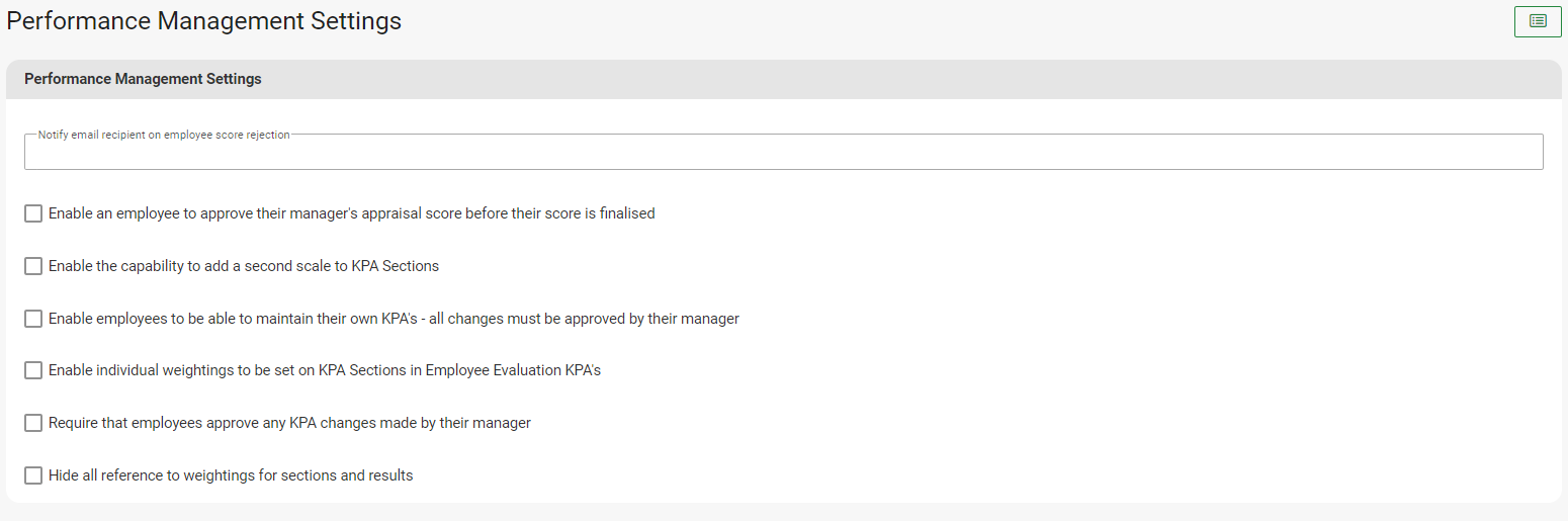 Allow employees to maintain their own KPAs – all changes must be approved by their manager: Gives the employee the ability to update their own KPAs, with the proviso that any changes must be approved by their manager.