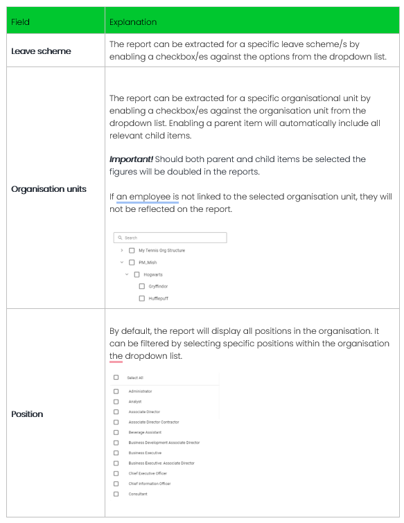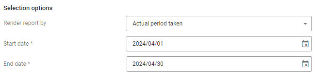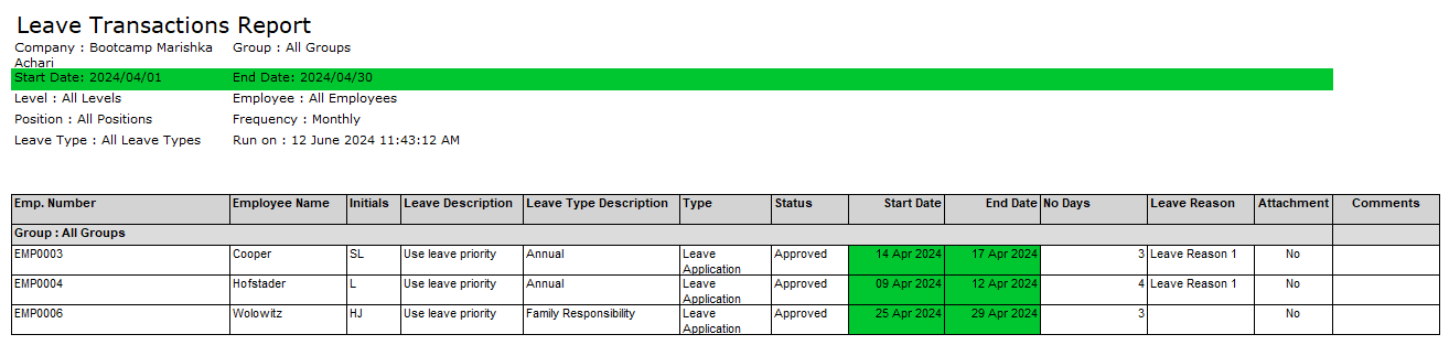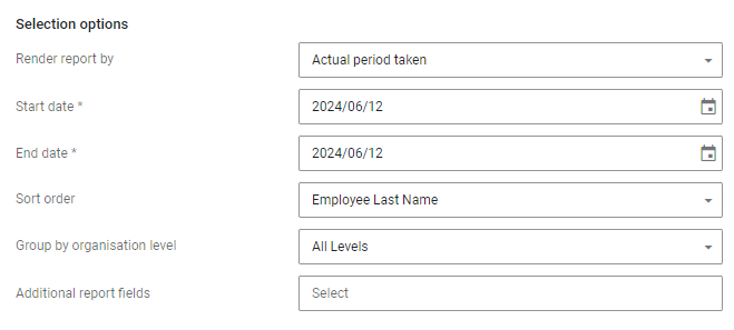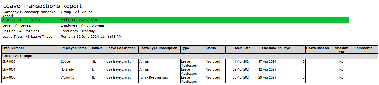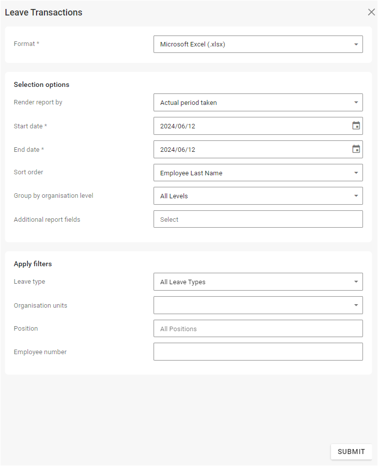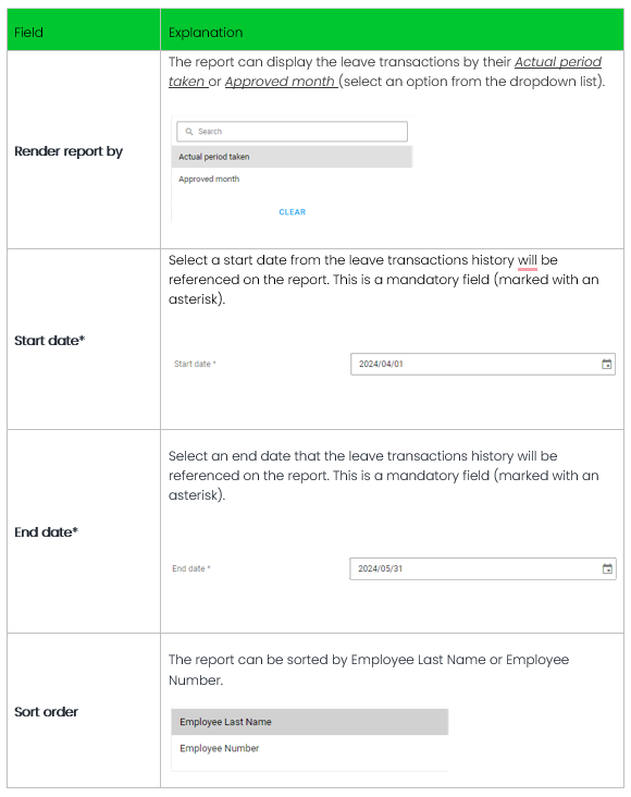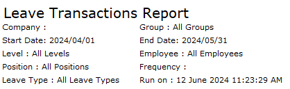 The Leave Transactions report provides a list of all leave transactions for a specified period; it can be generated according to the actual period taken or approval month.