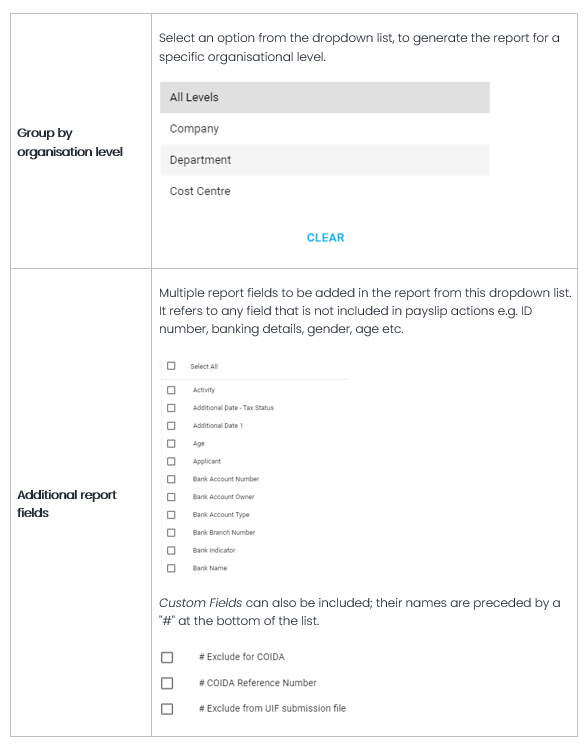 Employees' non-financial data can be analysed on the Dynamic Employee Details Report. Navigate > Reports > Reports > Nextgen > Human Resources Note! Make use of the Additional Fields on the report parameters screen to configure the report to your ...