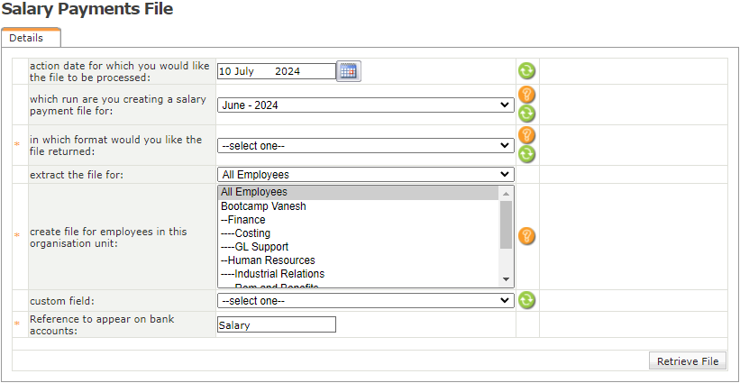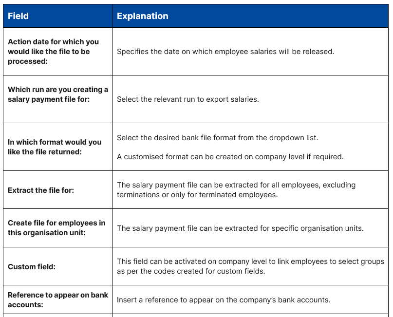 Once the payroll has been finalised and the run is closed, you can proceed to pay employees by exporting the Salary Payment File. Based on the screen selections, the salary payment file will generate in the applicable format for bank processing.