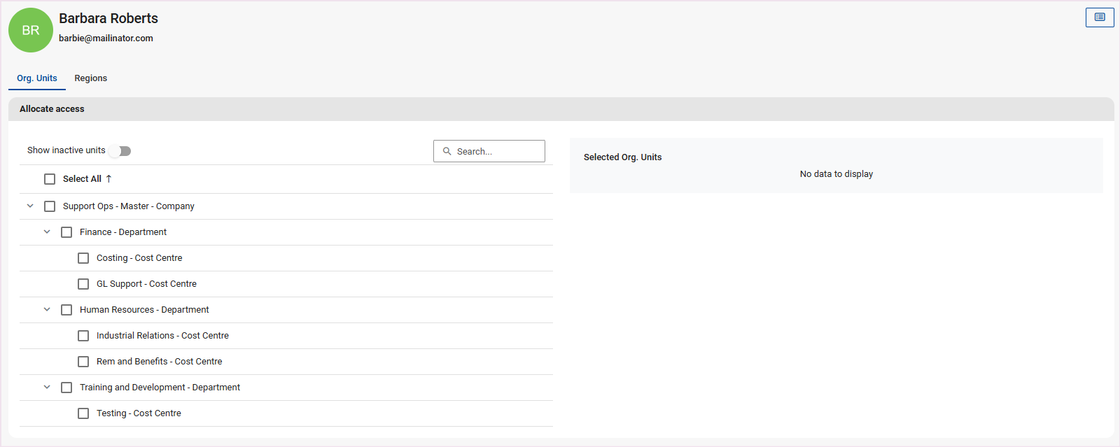 To specify the Organisation Hierarchy Units and Regions for a user, switch off the "allow access to all employees" toggle. You will then be directed to allocate the necessary access.