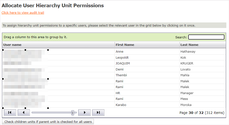 Only Company Level Users will reflect on the grid. If a user cannot access an employee record and all the units/regions have been selected, the employee record in question might not be linked a position. If none of the organisational units or regions are selected, the user, by default, will have access to all employees.