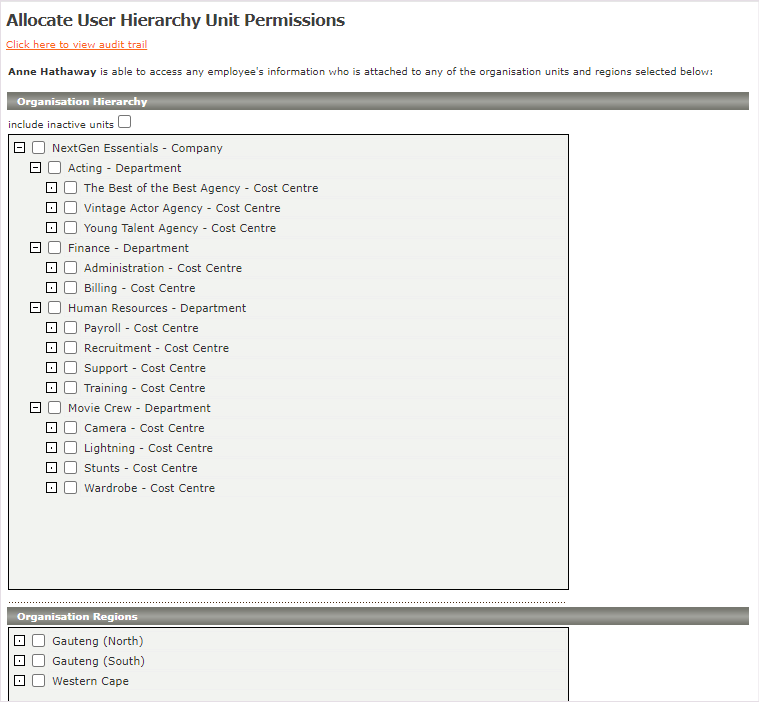 Further to company and frequency access defined on the User Profiles Screen, the User Org. Unit Permission Screen allows you to specify which employees a user will have access to on Organisation Hierarchy Unit or Region level.