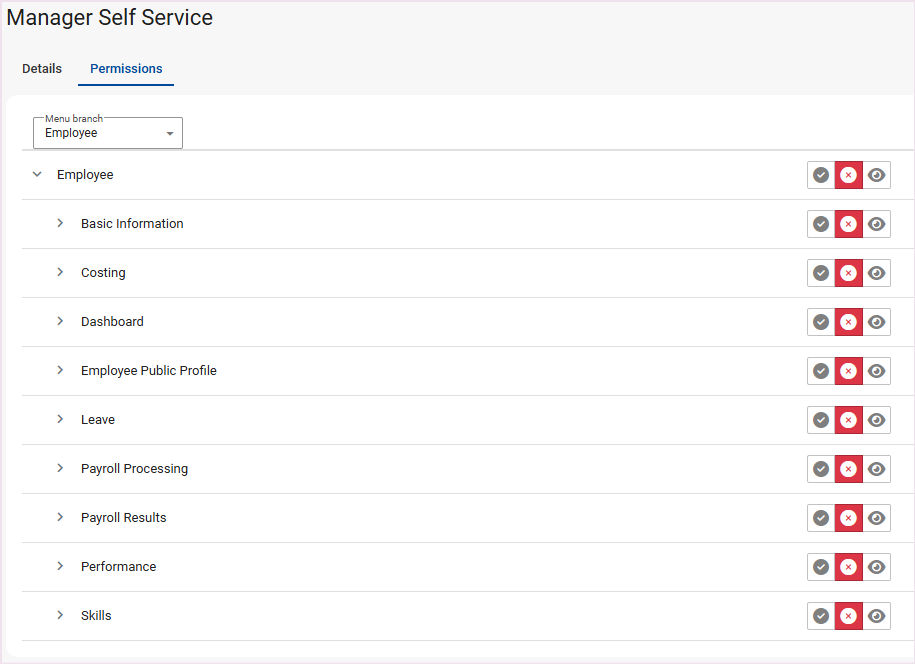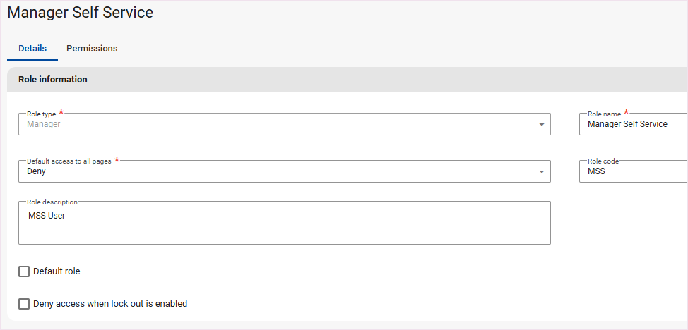 To utilise Manager Self Service, a MSS Security Role should be created to specify the relevant screen permissions the managers should have access to.