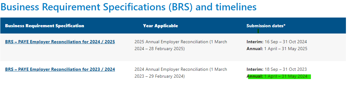 According to the South African Revenue Service (SARS) website, the Employer Annual Reconciliation Declaration period opens on 1 April 2024, and closes on 31 May 2024 (see below).