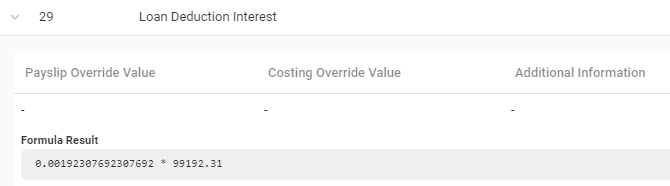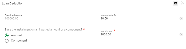 The Loan Deduction Interest Note Component will take the outstanding balance of the loan and multiply it by the monthly/fortnightly/weekly interest rate (depending on the frequency) provided by the user.