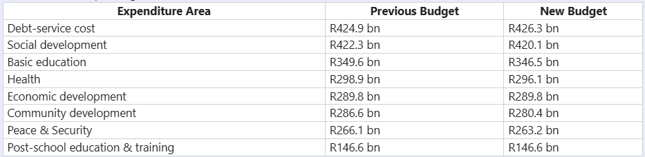 - To offset the shortfall caused by the withdrawn VAT hike (estimated at R75 billion), government has opted for spending cuts rather than new taxes, reducing expenditure by R69 billion over the medium term.