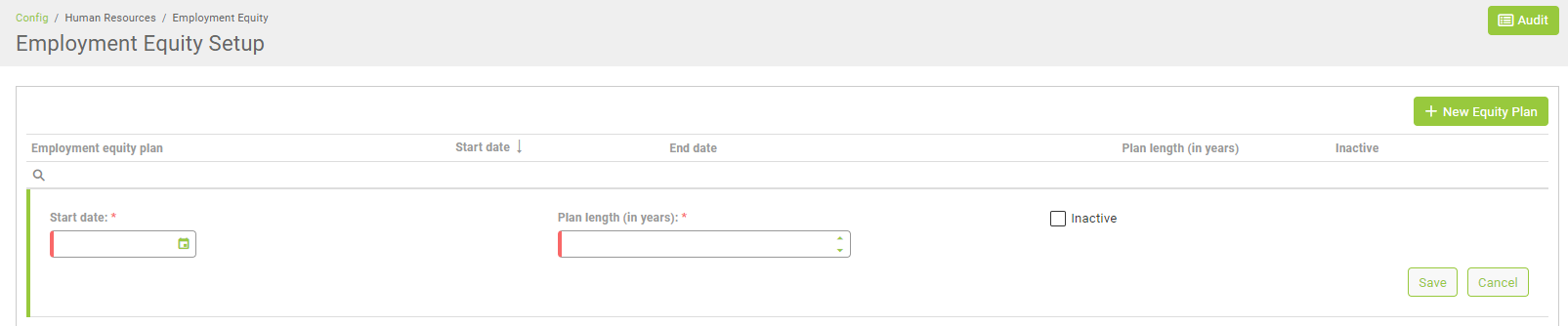 Select the "+ New Equity Plan" field to insert the Employment Equity Plan's start date, plan length and whether or not it is inactive.