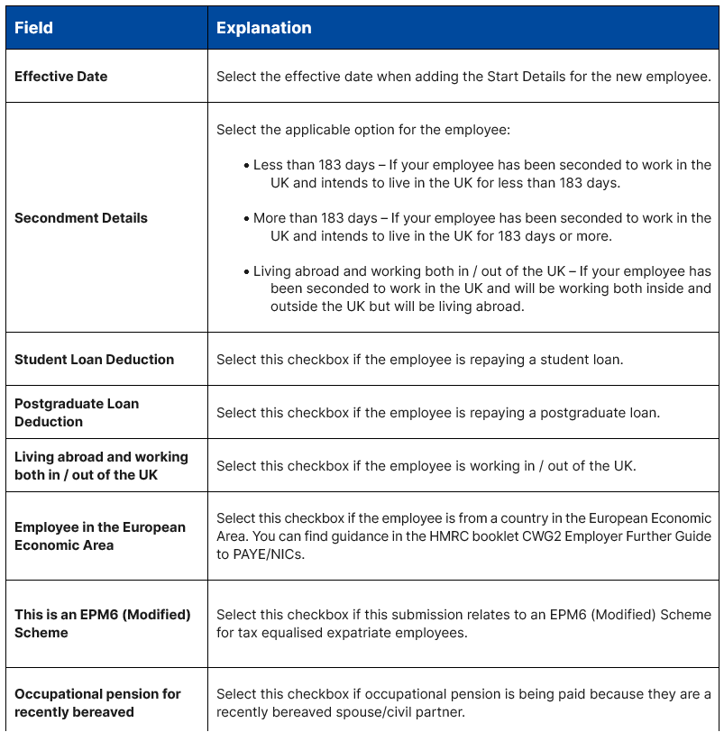 Starter Details are captured for new employees and replaces the P46 form. These details are reported on the Full Payment Submission (FPS).