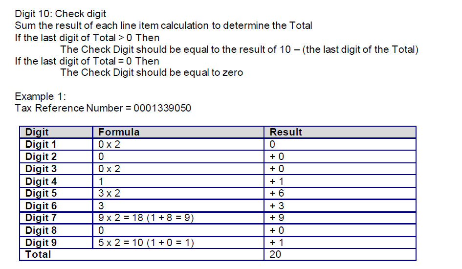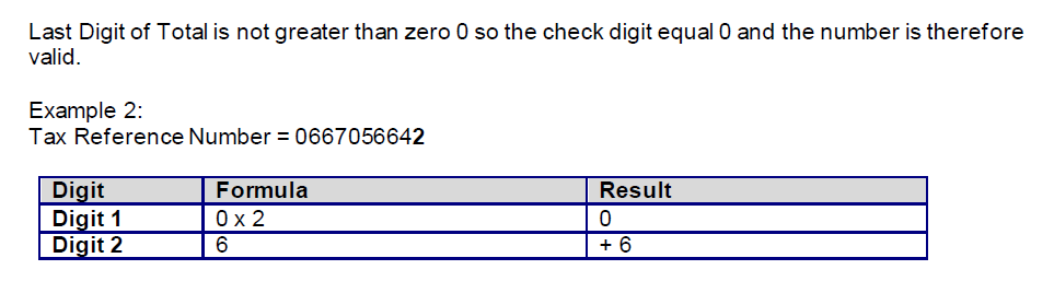 In the above example the final digit of total is not greater than zero, which results in the check digit to be equal to 0 and the number is then valid and accepted.