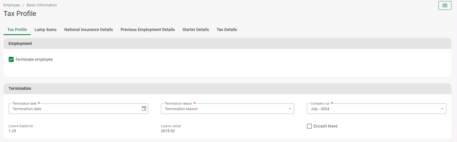 Overview The Employee Tax Profile Screen stores information relating to the employee’s tax calculation, National Insurance Details, Starter Details, and Previous Employment Details. Edition This feature is available on all PaySpace editions. ...