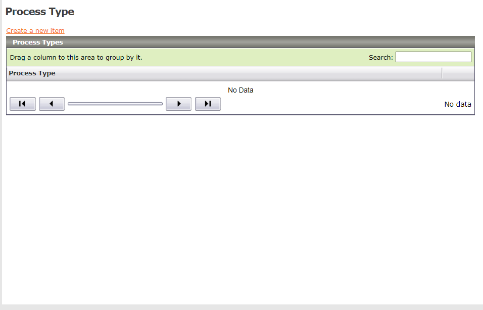 Drag a column to this area to group by it: Statement to group the data by dragging a specific column to that area. This allows you to organize or view process types in a custom way.