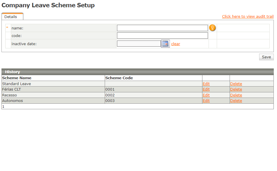 Description: Name of the leave scheme (or type of leave) that you want to create or modify. Examples of names might be "CLT Vacation" or "Recess."