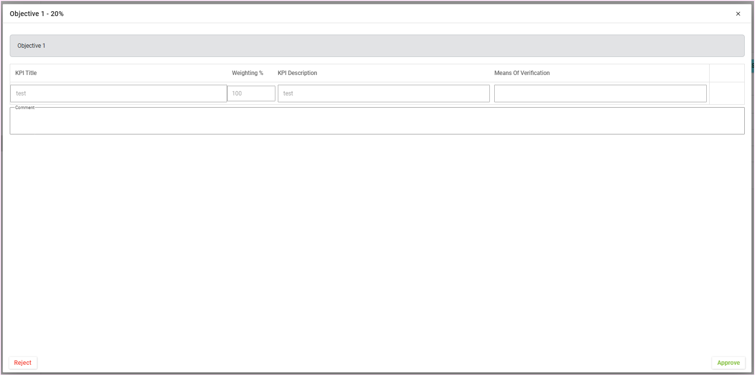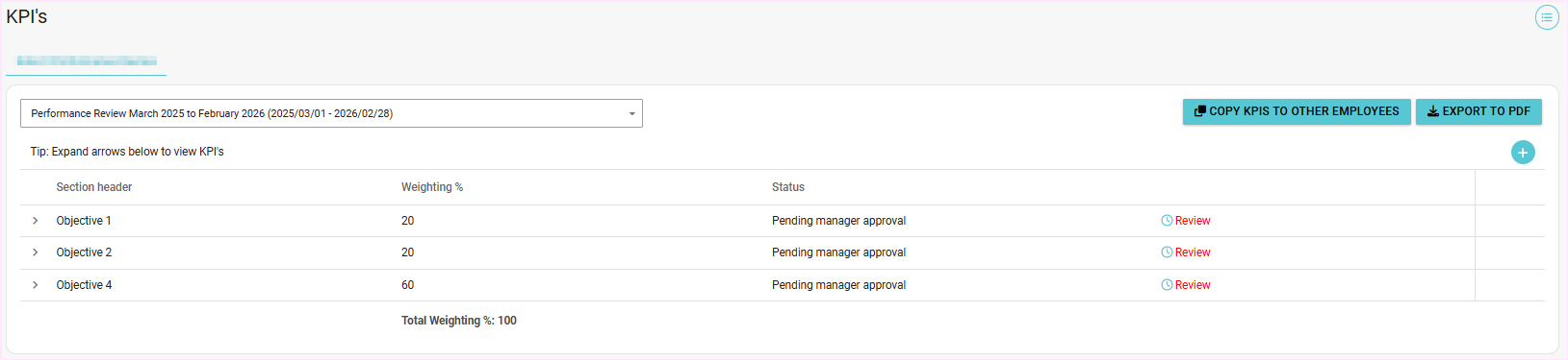 If one rater updates an employee’s KPI and the changes require approval from another rater, a red "Review" indicator will appear on the employee’s KPI screen. Selecting the "Review" indicator allows the employee or manager to approve or decline the changes.